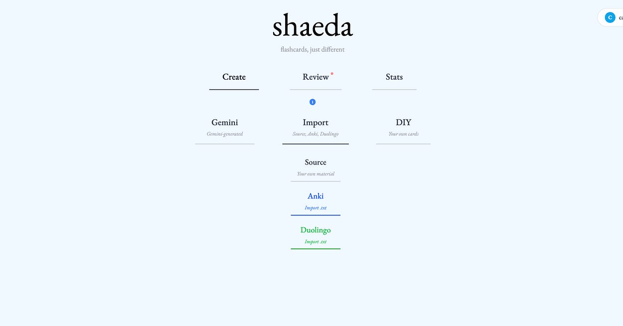 XP, Anki import, Duolingo import, Source import, DIY cards, Diagnostic Test, Leaderboard, Pricing, Shaeda vs Others